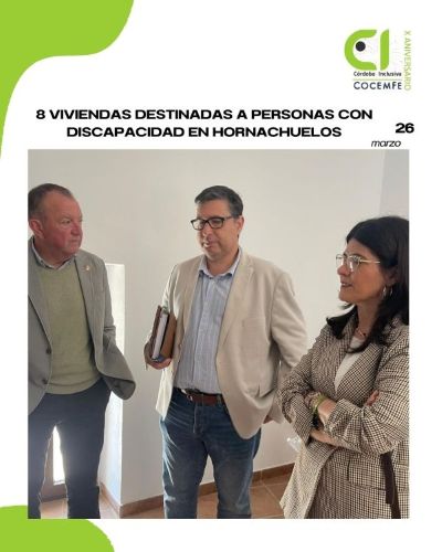 La presidenta de Córdoba Inclusiva- COCEMFE, María José Urbano Maldonado y Antonio Navarro García tesorero y gerente de Apannedis, han estado presentes hoy, junto al alcalde de Hornachuelos, Julián López, en el acto de entrega de llaves de las nuevas viviendas protegidas en la calle Béjar.