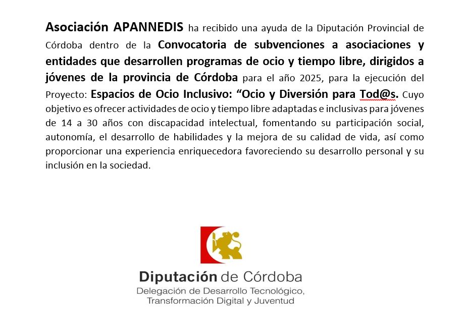 La Asociación APANNEDIS ha sido beneficiaria de una ayuda de la Diputación Provincial de Córdoba dentro de la convocatoria de subvenciones para programas de ocio y tiempo libre dirigidos a jóvenes de la provincia en 2025.