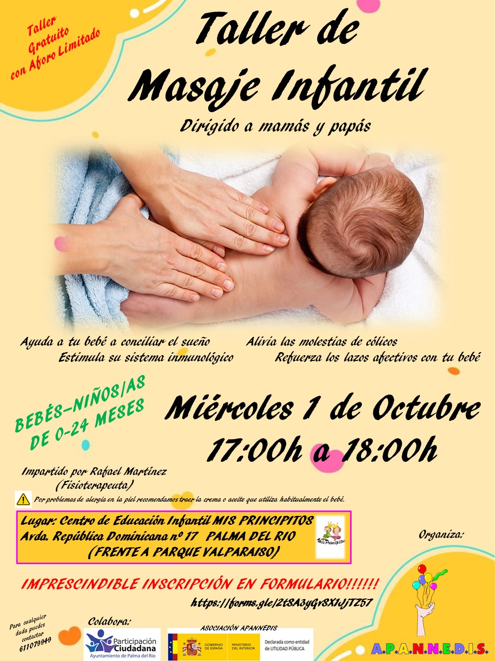 Impartido por Rafael Martínez (fisioterapeuta), este taller tiene como finalidad acercar ciertos conocimientos a padres y madres relativos a la conciliación del sueño, estimulación de sistema inmunológico, alivio de molestias de cólicos y creación y refuerzo de lazos afectivos con sus bebés y niños/as de 0-24 meses.